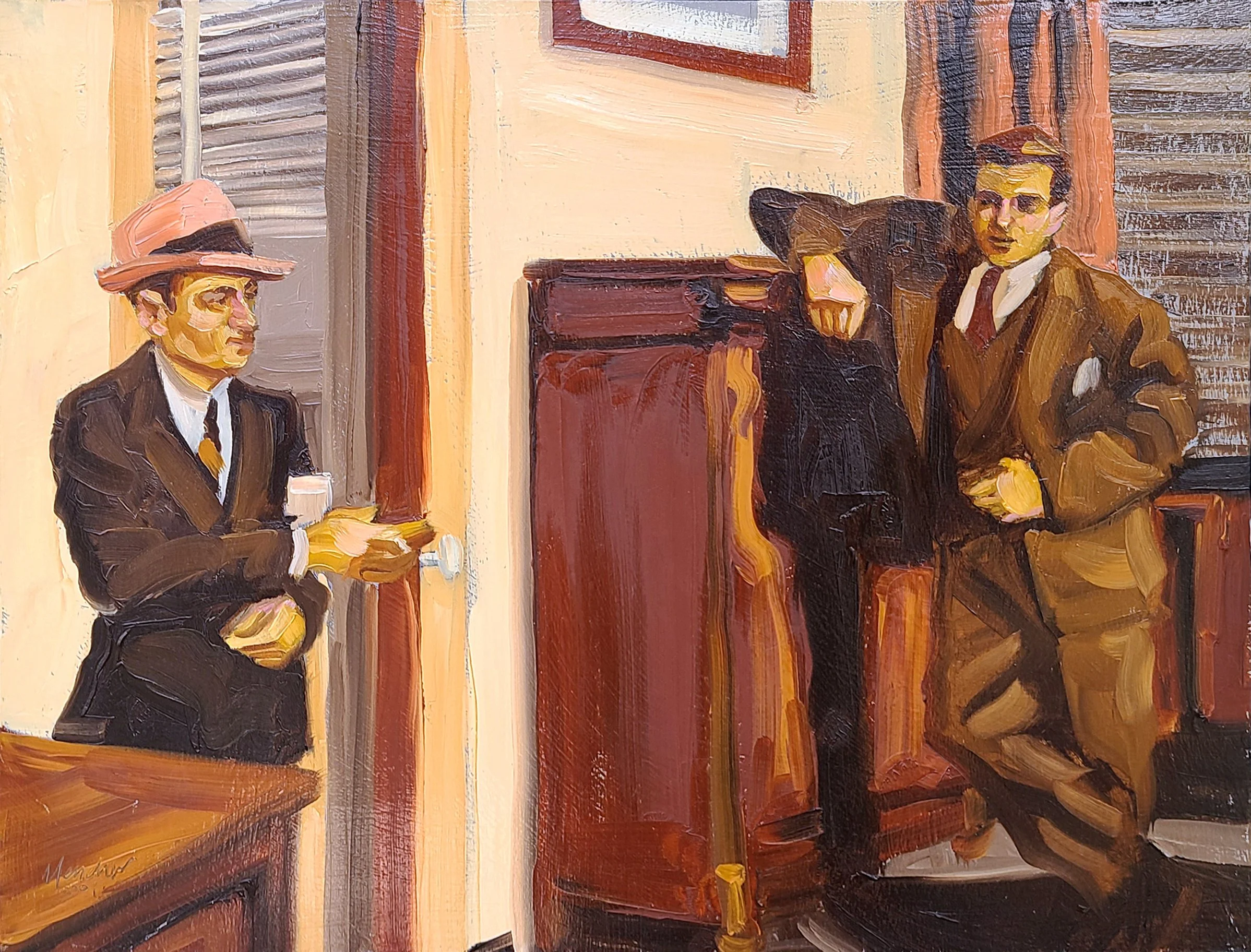2001, After Hours Visit, oil on panel, 16X20 inches (painting), 18X22 inches (framed) by Kenney Mencher
